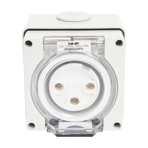 NHP ISO Socket Outlet, 3 Round Pins 32A 250V AC, w/ Base, Grey***EMAIL/TEXT FOR PRICING***