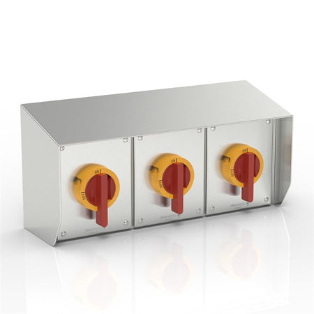 - Supplied With: 3 x Rotary Isolator Switches (32 A - 3 Pole), IP69K / IP66 Internal Threaded Wall Fixing Points, 2 x Internal Separators, 3 x DIN Rails, 3 x Lids with Gasket, Captive Lid Fixing Screws & Earth Terminals