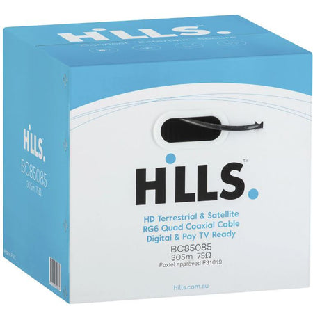 RG6 Quad-shield Coaxial Cable - 305m Roll Austar Approved Quality RG6 quad type, 75 Ohm coaxial cable. Suitable for outdoor antenna installations. RG6/U quad-shield 75-ohm coaxial cable for Digital TV, CATV, SATV and CCTV/Security Camera applications. Low-loss for use on long runs. Aluminium braid and foil shields. Gas-injected (foamed) PE dielectric. Copper clad steel conductor for tensile strength and reliable connection to F-connectors. Black jacket with count-down metre-marking. Recommended for an upgrading of existing installations. Recommended for new home cabling and digital TV installations. Features No more Knots or Twisted Cable Supported by Internal Heavy Duty Cable Caddy Pulls out Smoothly & Easily Heavy Duty Waxed Cardboard Box Reversed Metre Marked Internal Reel can be removed Strengthened Carry Handles both Ends Pay TV Approved Available in 305m Boxes WARRANTY: 1 Years Why 4Cabling?: 100% Aussie Owned and Operated Expert Advice and Sales Team Trusted by Over 100,000 Aussie Customers ISO 9001, NSW & QLD Government Approved Supplier Massive Stock Levels, Ready to Go Lightning Fast Delivery Nationwide Warranty & Easy Return Policy Secure Online Shopping 24/7